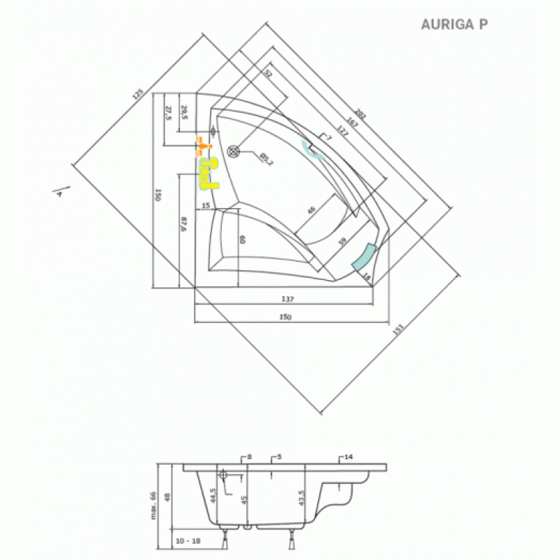 TEIKO Vaňa Auriga P rohová 150x150 cm, akrylátová, biela, pravá V111150R04T04001Rozmer: 150 x150 x45 cm