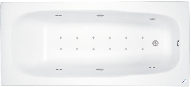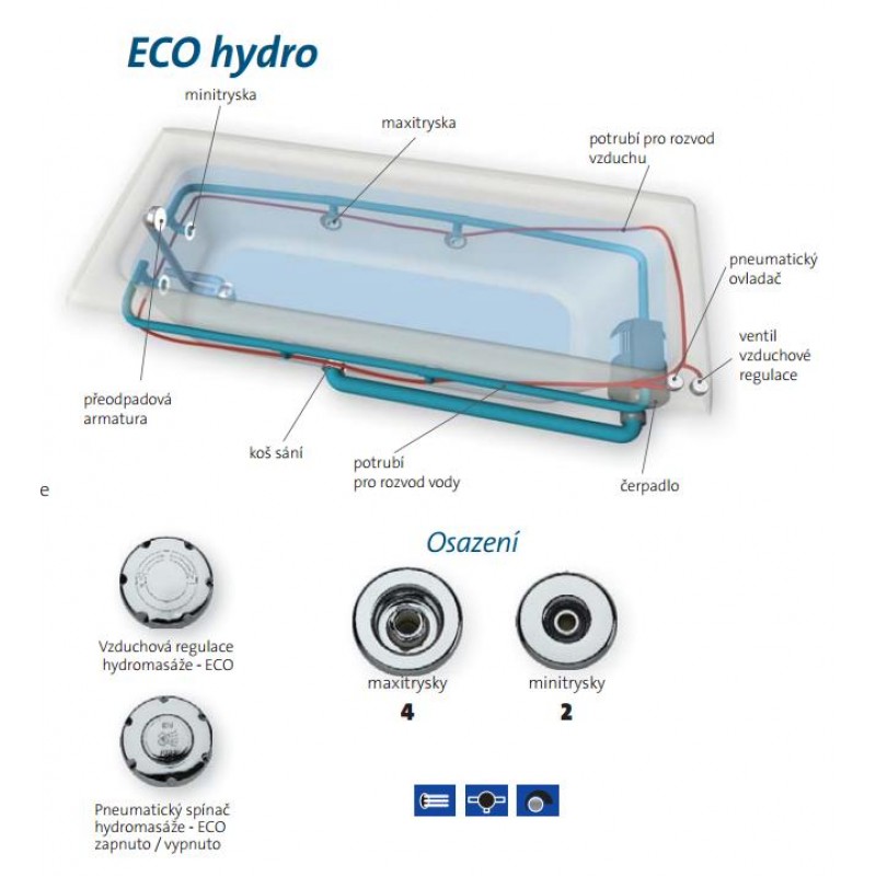 Hydromasážny systém je osadený 4-mi maxitryskami a 2-mi minitryskami. Tieto vytvárajú príjemný prúd vody obohatený vzduchom. Moderné regulačné a ovládacie prvky zaručujú veľmi jednoduché a pohodlné ovládanie. Spustenie a vypnutie sa vykonáva pneumatickým spínačom, ktorý je umiestnený na hornom okraji vane. Vzduchová regulácia obohacuje vodná masáž vzduchom, ktorý mení účinky masáže. Intenzitu masáže možno meniť otváraním alebo zatváraním maxitrysek - max 2 ks súčasne.