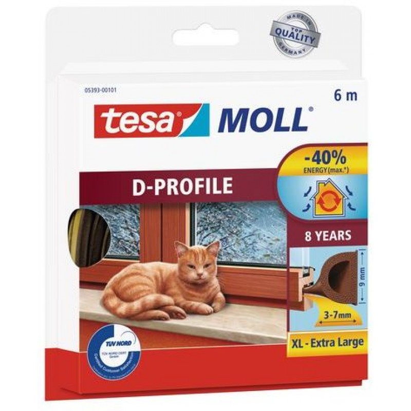 TESA MOLL Gumové tesnenie, hnedé, na okná a dvere, D profil, 6m 05393-00103-00Samolepiace ľahko použiteľné gumové tesnenie TESA MOLL pre okná a dvere. Vysoko kvalitné gumové profily odolávajú väčšine poveternostných podmienok a ľahko sa nalepujú.