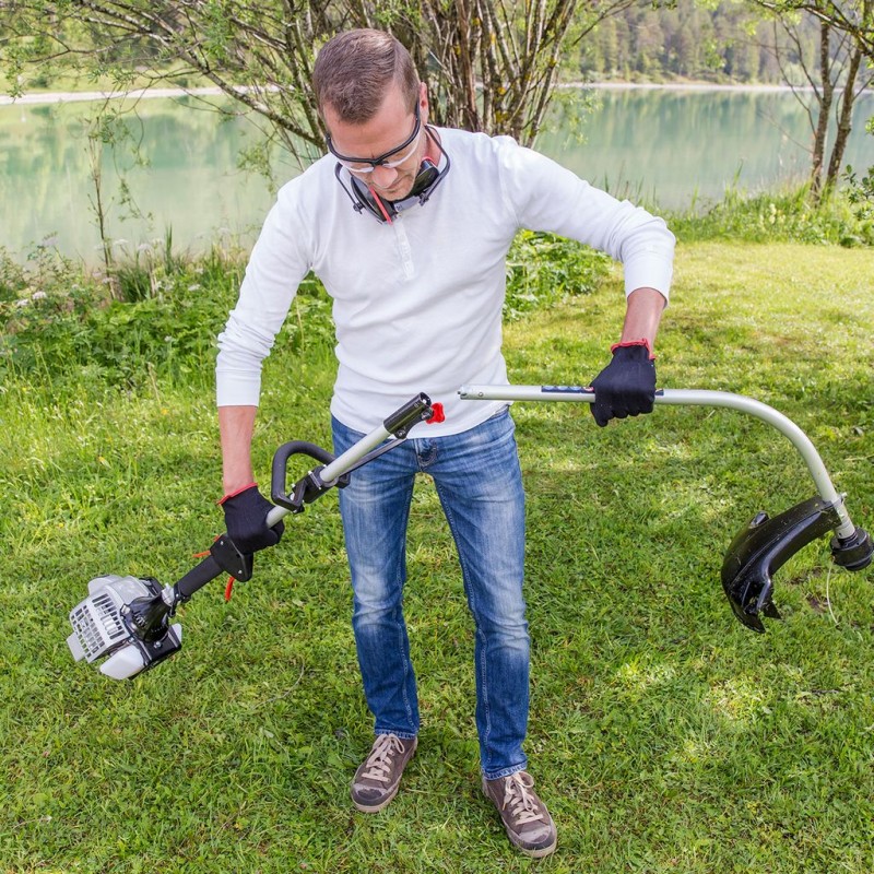 • Nízka hmotnosť, nastaviteľná, optimálne tvarovaná všestranná pomocná rukoväť (kľučka L / slučka) a pohodlný automatický systém hrotov pre optimálnu dĺžku závitu zaisťujú bezpečnú a ľahkú manipuláciu s kosou.