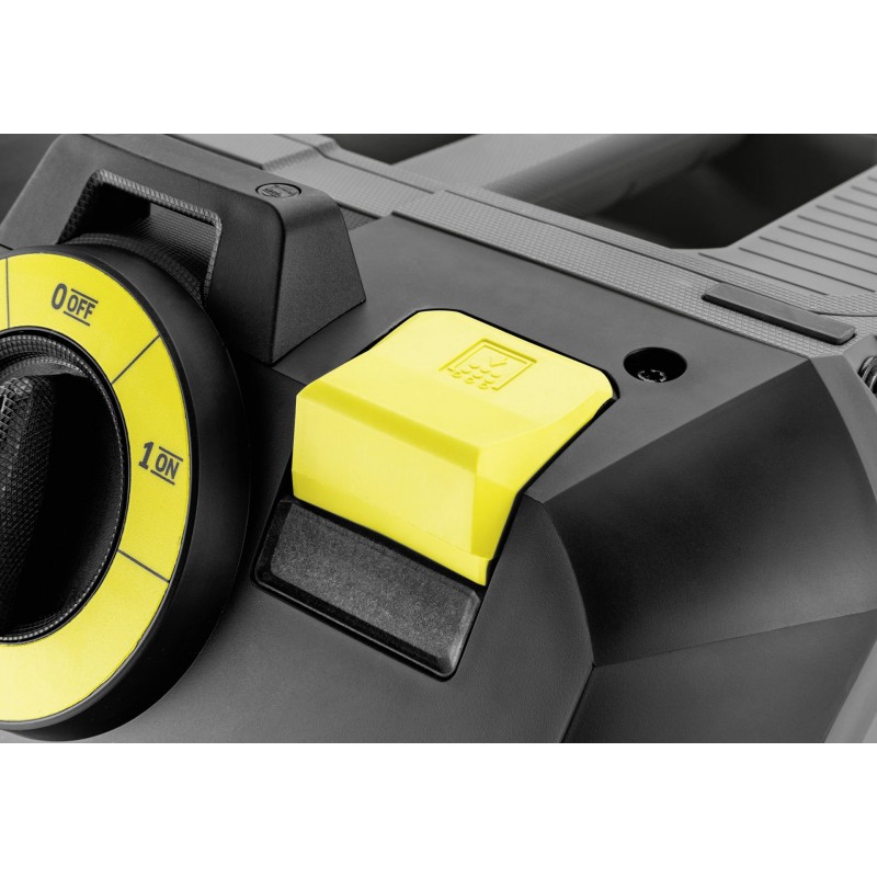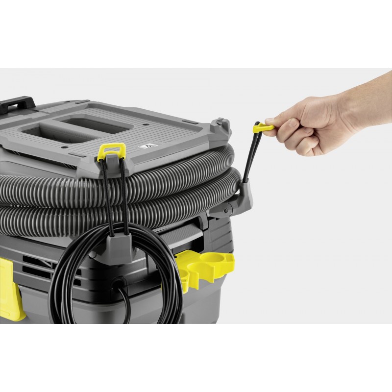 Okrem vysoko efektívneho poloautomatického oklepu filtra patrí integrovaná strojová zásuvka s automatickým vypínaním a zapínaním na prácu s elektronáradí k vynikajúcej výbave nášho kompaktného mokro-suchého vysávača NT 30/1 Ap Te L. Jeho excelentný sací výkon umožňuje rôznorodé využitie, či už pri menšom brúsení, pri čistení interiéru áut, odstraňovaní kvapalín alebo pri odsávaní strojov a zariadení. Dokonca aj stredné množstvá jemného prachu je možné bez problémov odsávať aj bez filtračného vrecka. Všetky základné nastavenia tohto jednoducho obsluhovaného stroja sa vykonávajú pomocou centrálneho prepínača a pre kompletne novo vyvinuté príslušenstvo sú integrované premyslené možnosti odkladania. Na extra plochú hlavu mokro-suchého vysávača je možné položiť kufor na náradie a upevniť ho.