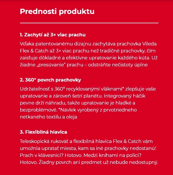 Flex & Catch nie je len prachovka, je to spoľahlivý, udržateľný a inovatívny pomocník pri upratovaní. Nech už upratujete ťažko dostupné miesta alebo sa snažíte o ekologickejší životný štýl, Vileda Flex & Catch zmení vaše upratovacie návyky.
