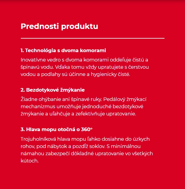 Systém rotačného mopu a vedra Vileda H2Pro využíva inovatívne vedro s dvoma komorami, ktoré zabezpečuje oddelenie čistej a špinavej vody pre efektívnejšie upratovanie. Bezdotykový žmýkací mechanizmus aktivovaný pedálom umožňuje ľahko regulovať vlhkosť mopu.