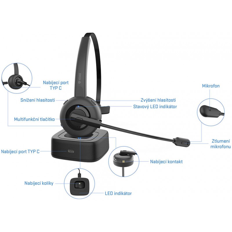 Bezdrôtová mono náhlavná súprava poskytuje pokročilý mikrofón s potlačením hluku pre prirodzený zvuk a Bluetooth V5.0 pre spoľahlivé a stabilné pripojenie. Pevná základňa nabíjacieho stojana s konektorom USB C poskytuje nepretržité nabíjanie náhlavnej súpravy a ich pohodlné ukladanie na pracovný stôl. Otočný mikrofón (otočenie o 270°) vám umožní používať náhlavnú súpravu na pravej alebo ľavej strane. Mikrofón môžete ľahko nastaviť do dokonalého uhla na zachytenie optimálneho zvuku alebo ho môžete okamžite stlmiť tlačidlom v hornej časti tela mikrofónu. Koženkové náušníky navrhnuté pre maximálne pohodlie a redukciu priestorového hluku. Pohodlná regulácia hlasitosti a univerzálne tlačidlo na ovládanie hudby, telefónnych hovorov a hlasovej asistencie.