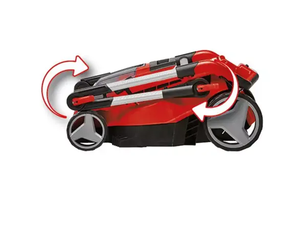 Kosačku je možné priestorovo úsporne skladovať vďaka sklopnej vodiacej tyči a ľahko prenášať pomocou integrovanej rukoväti.