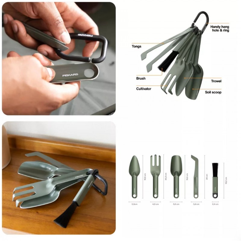 Fiskars sada náradia na kultiváciu obsahuje päť odolných nástrojov z kvalitnej nehrdzavejúcej ocele. Ideálna na presádzanie rastlín v kvetináčoch a starostlivosť o rastliny na balkónoch, terasách a parapetoch, vrátane kaktusov a tŕnistých rastlín.