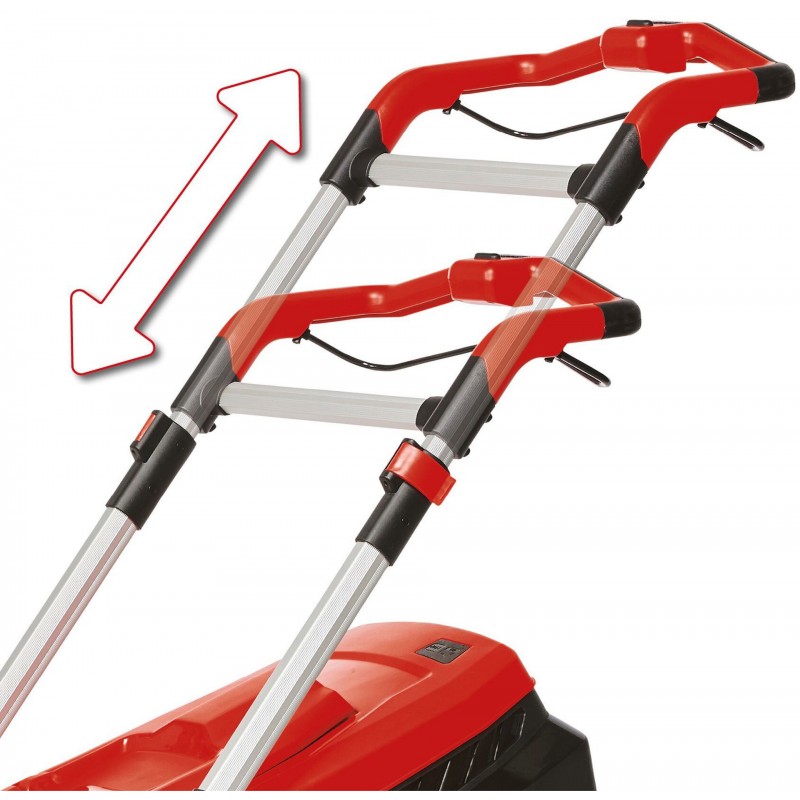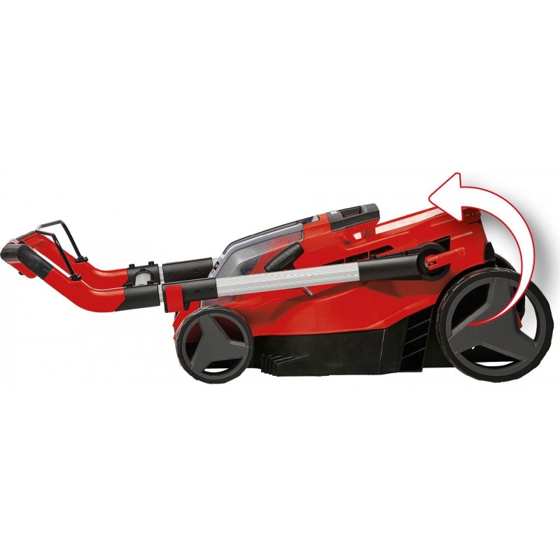 Teleskopickú, výškovo nastaviteľnú rukoväť je možné individuálne prispôsobiť každému používateľovi a pre jednoduchšie skladovanie ju možno sklopiť. Na jednoduchú prepravu slúži integrovaná rukoväť. Dlhé madlo je vyrobené z hliníka, vďaka čomu je ľahké a zároveň pevné. Zberný kôš na trávu má objem 45 litrov a je vybavený praktickým ukazovateľom naplnenia. Výrobok je dodávaný s batériami, rýchlonabíjačkou a praktickou mulčovacou vložkou.