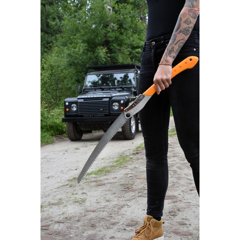 Pílu je možné jednoducho zložiť a rozložiť pomocou aretačného tlačidla, ktoré zároveň umožňuje nastaviť 2 rôzne polohy rezania. Gumová rukoväť zaisťuje bezpečný a pohodlný úchop a je dostatočne veľká na to, aby ste mohli pílu používať oboma rukami. Pre väčšiu praktickosť je v rukoväti otvor, ktorý umožňuje k píle pripevniť karabínu alebo lano.